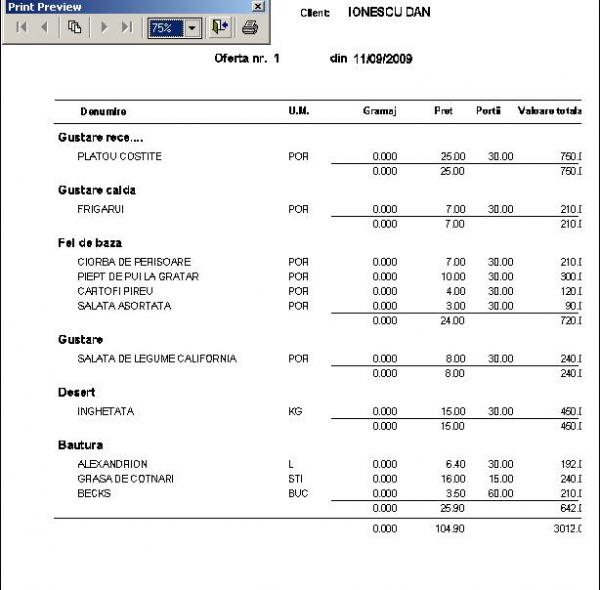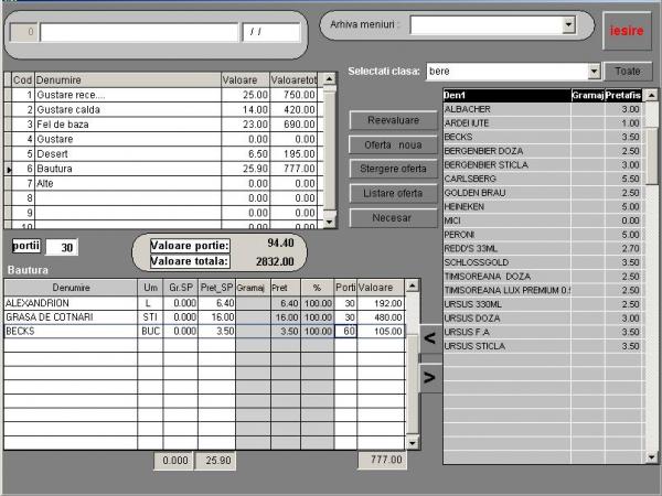 intocmeste o oferta pentru mese festive (nuti, botezuri, etc) pe baza listei de meniu din programul de restaurant. Se pot introduce si gramaje mai mici sau mai mari fata de cele standard, programul calculand pretul unui meniu, si apoi valoarea totala in functie de numarul de participanti. Deasenea