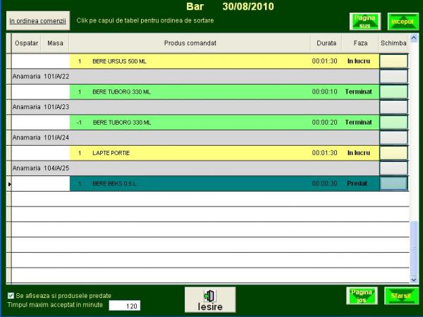 Programul ruleaza pe un monitor (de preferinta senzitiv) aflat la gestiuni (bucatarie, bar, etc.) Pe ecran se vad comenzile date de ospatari astfel bucatarii, respectiv barmanii au posibilitatea sa anunte faza in care se gasete preparatul (in lucru, terminat sau predat). Acest sistem se suprapune peste metoda transmiterii comenzilor cu imprimante de gestiune fiind foarte util acolo unde comenzile se iau de catre mai multi bucatari.